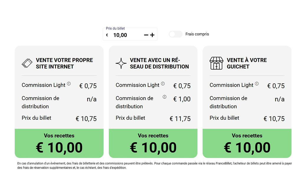 Vendez un maximum de billetsSur votre propre site internet (que vous en ayez déjà un ou que nous vous en procurions un gratuitement) ou sur réseau France Billet visité par plus de 8 millions de personne par mois (Fnac Spectacles, Eventim.fr, FranceBillet) !