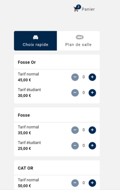 Proposez à vos acheteurs de billets de choisir librement leur place sur le plan de salle ou de prendre l'option “Choix rapide” qui permet d'avoir les meilleures places dans la catégorie de leur choix.